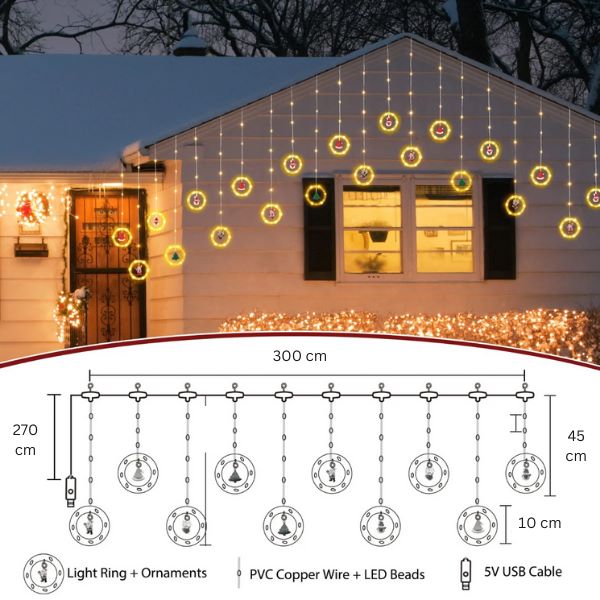 Delicate glinsterende lichtjes, zorgvuldig geplaatst in transparante ringen, genereren een betoverende sfeer terwijl ze een stralende gloed werpen op hangende figuurtjes.