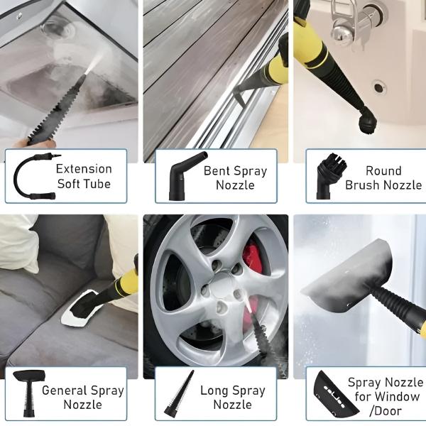 Inclusief borstels, mondstukken en pads voor het reinigen van vloeren, voegen, ramen en meer.