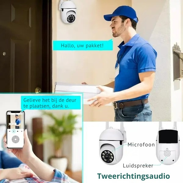 De buitenbewakingscamera heeft een ingebouwde responsieve microfoon waarmee u kunt luisteren en praten via onze app. De tweeweg audio stelt u in staat om met uw gasten te communiceren, terwijl de bewegingsmelders u helpen om snel van ongewenste bezoekers of dieren te verlossen.