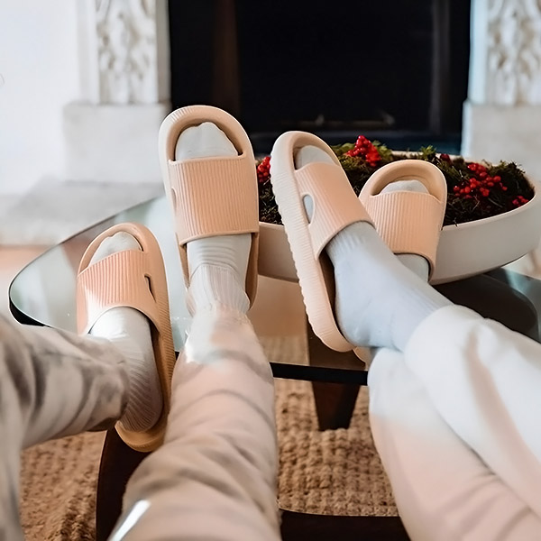 Geniet van rust en comfort thuis met FLIPSY-pantoffels. Lichtgewicht, fluisterstil en slipAvast, ze zijn perfect voor ontspannen ochtenden en stevige stappen op hardhouten, betegelde of tapijtvloeren.