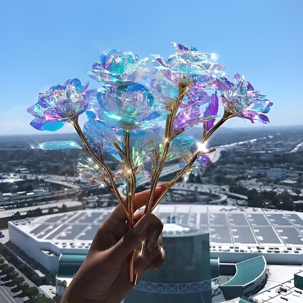 Elke roos is gemaakt met een iriserende, holografische coating die prachtig glinstert in het licht, waardoor een melkwegachtige schittering ontstaat die gewoonweg betoverend is.