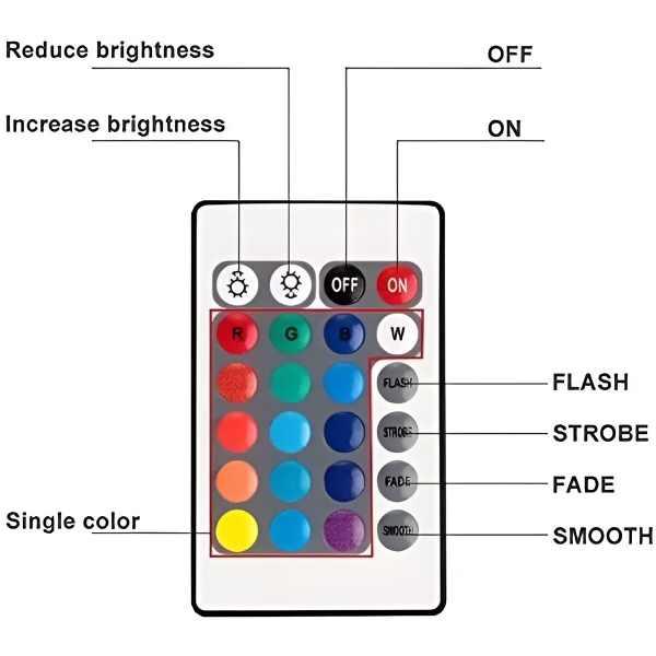 AQUASHEIN wordt geleverd met een handige afstandsbediening waarmee je de verlichting eenvoudig kunt aanpassen. Met 24 toetsen kun je kiezen uit 16 RGB-kleuren en vier dynamische standen (flitser, stroboscoop, fade, vloeiend). Bedien de lampen vanaf een afstand van maximaal 10 meter en zorg voor probleemloos maatwerk.