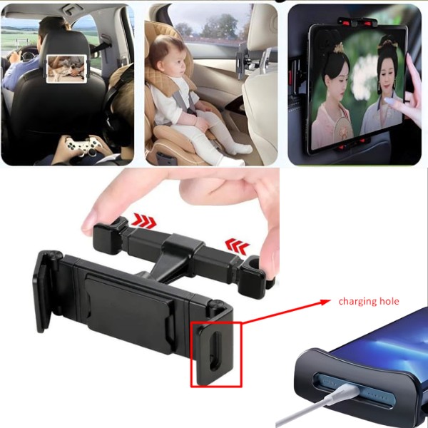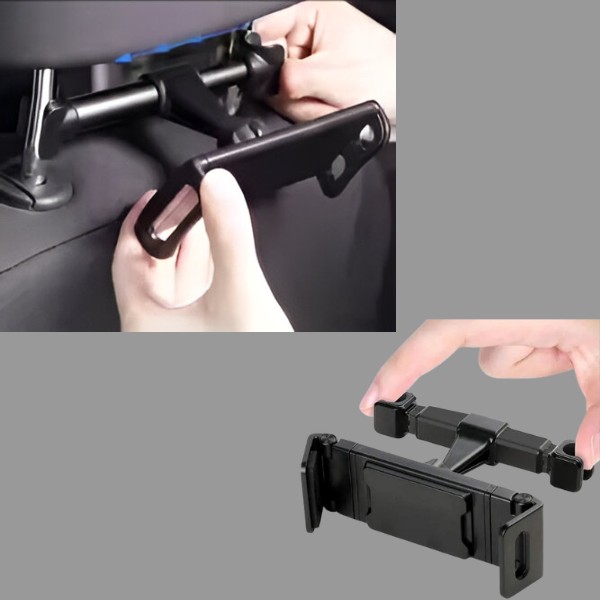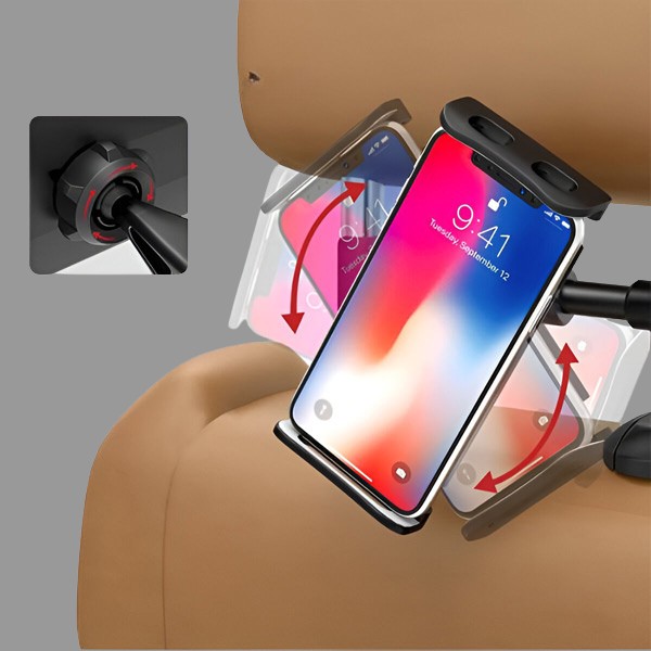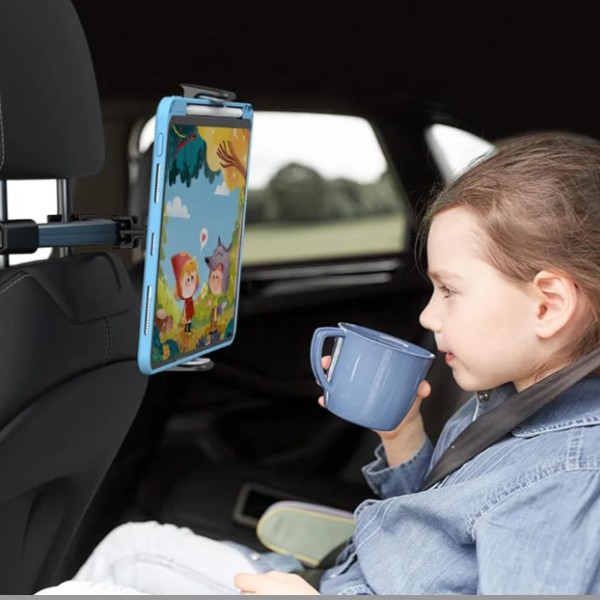Bevestig de houder eenvoudig aan de hoofdsteun van de voorstoel, pas de hoek aan en laat kinderen hun favoriete shows kijken. Met 360° rotatie en uitschuifbare armen past hij op alle apparaten tussen 12-20 cm.